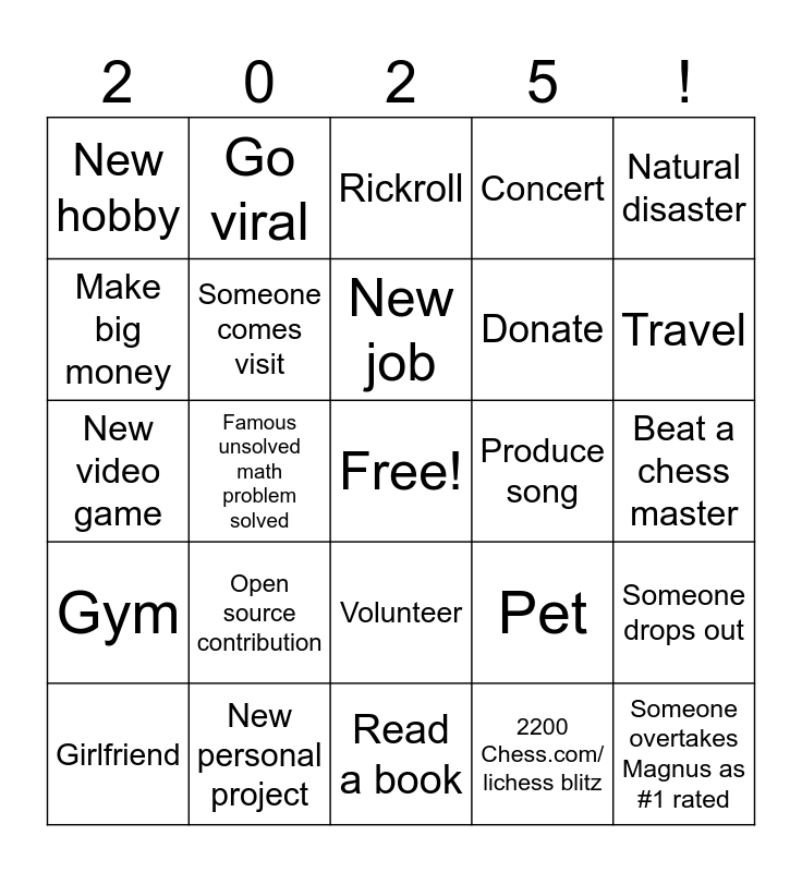 This bingo card has a free space and 24 words: Open source contribution, New personal project, New job, Girlfriend, Natural disaster, New hobby, Make big money, Go viral, Produce song, Volunteer, Donate, New video game, Pet, Someone drops out, Someone comes visit, 2200 Chess.com/ lichess blitz, Beat a chess master, Rickroll, Travel, Famous unsolved math problem solved, Someone overtakes Magnus as #1 rated, Gym, Concert and Read a book.