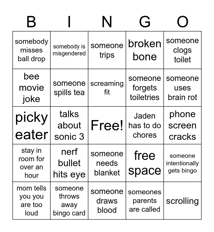 This bingo card has a free space and 25 words: nerf bullet hits eye, someone draws blood, screaming fit, mom tells you you are too loud, someone clogs toilet, somebody misses ball drop, bee movie joke, somebody is misgendered, Jaden has to do chores, someone needs blanket, someone forgets toiletries, picky eater, free space, someone intentionally gets bingo, someone spills tea, someone asks for more milk, phone screen cracks, someone trips, someone uses brain rot, talks about sonic 3, scrolling, someone throws away bingo card, stay in room for over an hour, broken bone and someones parents are called.