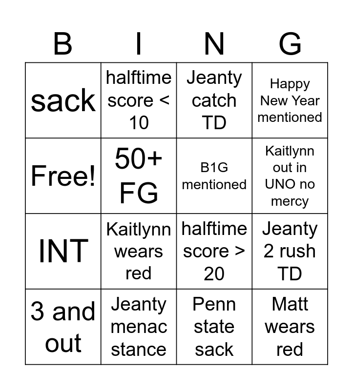 This bingo card has 16 words: Jeanty menac stance, Jeanty 2 rush TD, Jeanty catch TD, sack, INT, halftime score < 10, halftime score > 20, Penn state sack, Free!, 50+ FG, 3 and out, Happy New Year mentioned, Kaitlynn wears red, Kaitlynn out in UNO no mercy, B1G mentioned and Matt wears red.