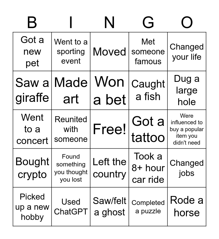This bingo card has a free space and 24 words: Found something you thought you lost, Used ChatGPT, Won a bet, Picked up a new hobby, Changed your life, Got a new pet, Saw a giraffe, Went to a sporting event, Got a tattoo, Left the country, Caught a fish, Went to a concert, Took a 8+ hour car ride, Changed jobs, Made art, Completed a puzzle, Were influenced to buy a popular item you didn't need, Moved, Dug a large hole, Reunited with someone, Rode a horse, Bought crypto, Met someone famous and Saw/felt a ghost.