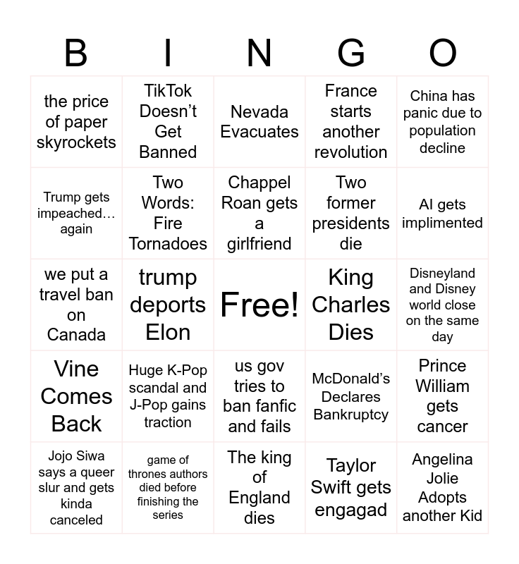 This bingo card has a free space and 24 words: Huge K-Pop scandal and J-Pop gains traction, game of thrones authors died before finishing the series, Chappel Roan gets a girlfriend, Jojo Siwa says a queer slur and gets kinda canceled, China has panic due to population decline, the price of paper skyrockets, Trump gets impeached… again, TikTok Doesn’t Get Banned, King Charles Dies, us gov tries to ban fanfic and fails, Two former presidents die, we put a travel ban on Canada, McDonald’s Declares Bankruptcy, Prince William gets cancer, Two Words: Fire Tornadoes, Taylor Swift gets engagad, Disneyland and Disney world close on the same day, Nevada Evacuates, AI gets implimented, trump deports Elon, Angelina Jolie Adopts another Kid, Vine Comes Back, France starts another revolution and The king of England dies.