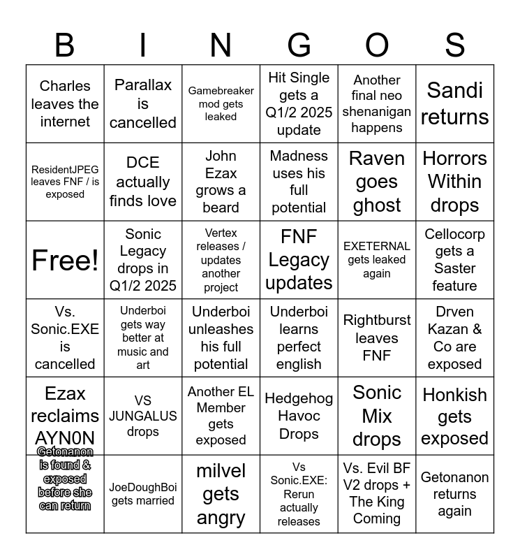 This bingo card has 36 words: Hedgehog Havoc Drops, Another EL Member gets exposed, Vs Sonic.EXE: Rerun actually releases, ResidentJPEG leaves FNF / is exposed, Vs. Sonic.EXE is cancelled, FNF Legacy updates, DCE actually finds love, milvel gets angry, Another final neo shenanigan happens, Sonic Mix drops, Horrors Within drops, Hit Single gets a Q1/2 2025 update, Honkish gets exposed, Sonic Legacy drops in Q1/2 2025, Madness uses his full potential, Charles leaves the internet, Ezax reclaims AYN0N, EXETERNAL gets leaked again, Free!, Gamebreaker mod gets leaked, Vertex releases / updates another project, Underboi gets way better at music and art, Underboi learns perfect english, Underboi unleashes his full potential, Rightburst leaves FNF, Parallax is cancelled, Raven goes ghost, JoeDoughBoi gets married, John Ezax grows a beard, Sandi returns, Getonanon returns again, Getonanon is found & exposed before she can return, Drven Kazan & Co are exposed, Cellocorp gets a Saster feature, VS JUNGALUS drops and Vs. Evil BF V2 drops + The King Coming.