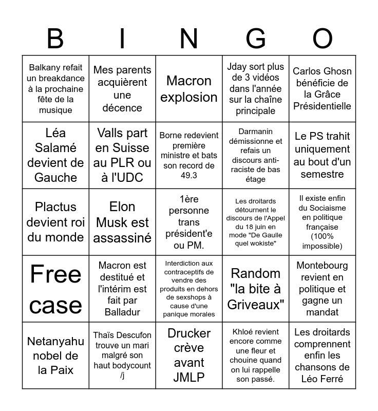 This bingo card has 25 words: Macron est destitué et l'intérim est fait par Balladur, Drucker crève avant JMLP, Borne redevient première ministre et bats son record de 49.3, Netanyahu nobel de la Paix, Carlos Ghosn bénéficie de la Grâce Présidentielle, Balkany refait un breakdance à la prochaine fête de la musique, Léa Salamé devient de Gauche, Mes parents acquièrent une décence, Les droitards détournent le discours de l'Appel du 18 juin en mode "De Gaulle quel wokiste", Interdiction aux contraceptifs de vendre des produits en dehors de sexshops à cause d'une panique morales, Darmanin démissionne et refais un discours anti-raciste de bas étage, Plactus devient roi du monde, Random "la bite à Griveaux", Montebourg revient en politique et gagne un mandat, Valls part en Suisse au PLR ou à l'UDC, Les droitards comprennent enfin les chansons de Léo Ferré, Il existe enfin du Sociaisme en politique française (100% impossible), Macron explosion, Le PS trahit uniquement au bout d'un semestre, Elon Musk est assassiné, 1ère personne trans président'e ou PM., Thaïs Descufon trouve un mari malgré son haut bodycount /j, Free case, Jday sort plus de 3 vidéos dans l'année sur la chaîne principale and Khloé revient encore comme une fleur et chouine quand on lui rappelle son passé..