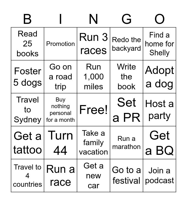 This bingo card has a free space and 24 words: Turn 44, Run a race, Run 1,000 miles, Travel to 4 countries, Find a home for Shelly, Read 25 books, Foster 5 dogs, Promotion, Set a PR, Take a family vacation, Write the book, Travel to Sydney, Run a marathon, Get a BQ, Go on a road trip, Go to a festival, Host a party, Run 3 races, Adopt a dog, Buy nothing personal for a month, Join a podcast, Get a tattoo, Redo the backyard and Get a new car.