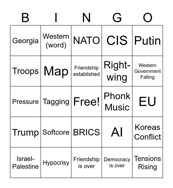 This bingo card has a free space and 24 words: Softcore, Hypocrisy, Friendship established, Israel-Palestine, Putin, Georgia, Troops, Western (word), Phonk Music, BRICS, Right-wing, Pressure, AI, Koreas Conflict, Map, Democracy is over, EU, NATO, Western Government Falling, Tagging, Tensions Rising, Trump, CIS and Friendship is over.