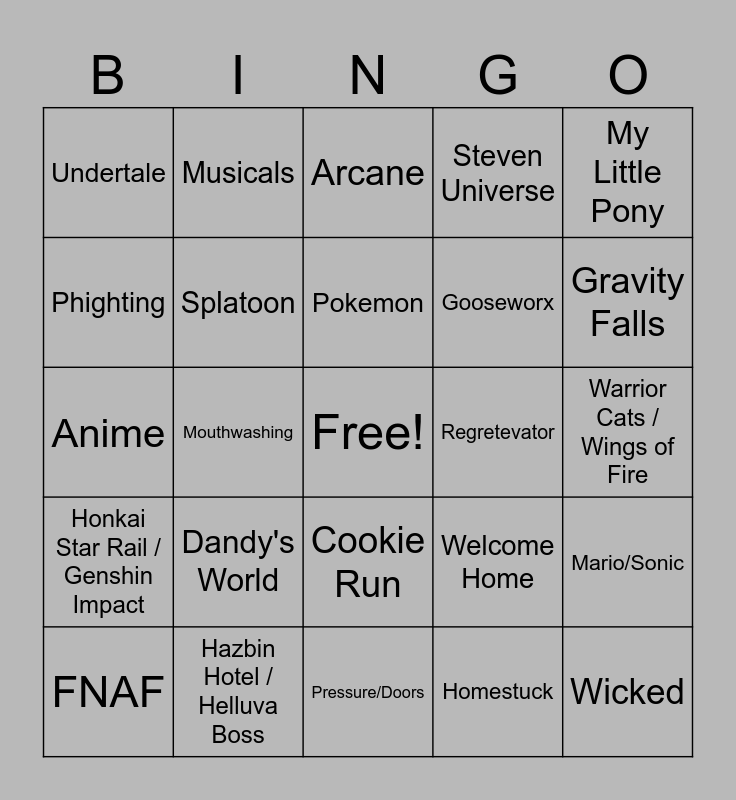 This bingo card has a free space and 24 words: Dandy's World, Hazbin Hotel / Helluva Boss, Pokemon, FNAF, My Little Pony, Undertale, Phighting, Musicals, Regretevator, Cookie Run, Gooseworx, Anime, Welcome Home, Mario/Sonic, Splatoon, Homestuck, Warrior Cats / Wings of Fire, Arcane, Gravity Falls, Mouthwashing, Wicked, Honkai Star Rail / Genshin Impact, Steven Universe and Pressure/Doors.