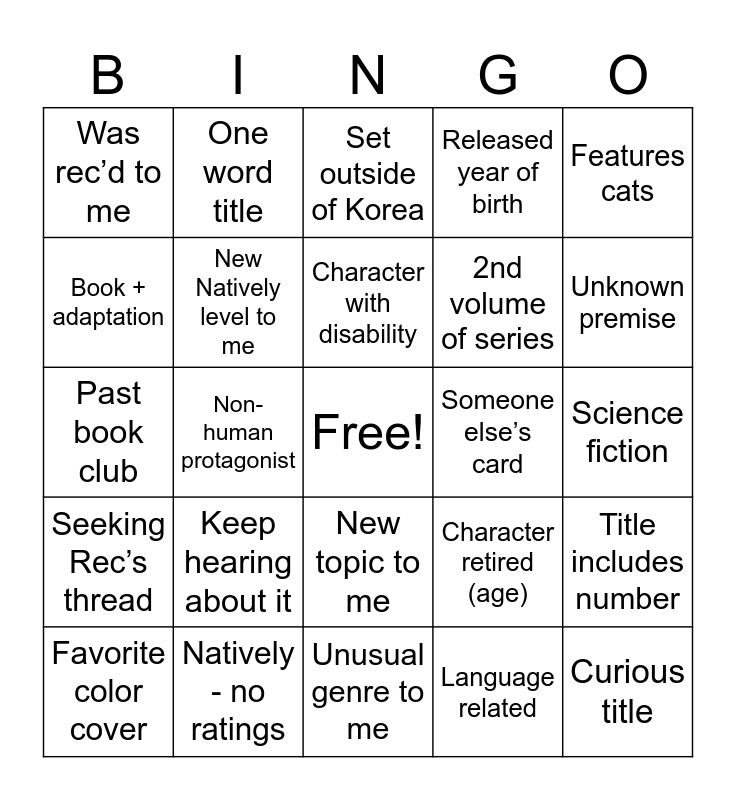 This bingo card has a free space and 24 words: Keep hearing about it, Natively - no ratings, Character with disability, Favorite color cover, Features cats, Was rec’d to me, Book + adaptation, One word title, Someone else’s card, New topic to me, 2nd volume of series, Past book club, Character retired (age), Title includes number, New Natively level to me, Language related, Science fiction, Set outside of Korea, Unknown premise, Non-human protagonist, Curious title, Seeking Rec’s thread, Released year of birth and Unusual genre to me.