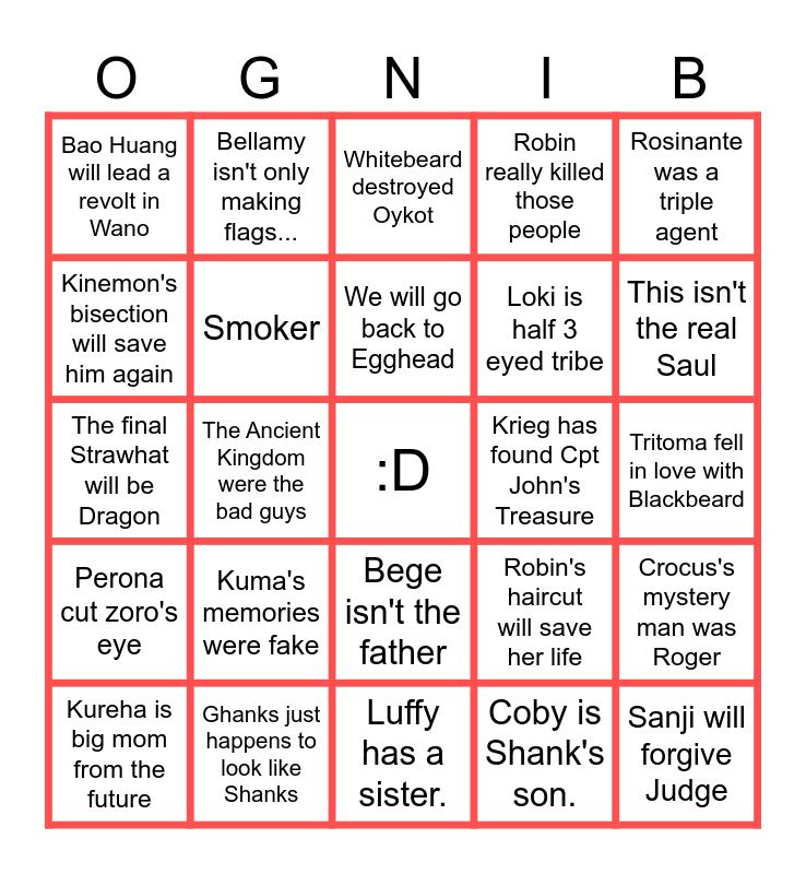 This bingo card has a free space and 24 words: Kuma's memories were fake, Ghanks just happens to look like Shanks, We will go back to Egghead, Kureha is big mom from the future, Rosinante was a triple agent, Bao Huang will lead a revolt in Wano, Kinemon's bisection will save him again, Bellamy isn't only making flags..., Krieg has found Cpt John's Treasure, Bege isn't the father, Loki is half 3 eyed tribe, The final Strawhat will be Dragon, Robin's haircut will save her life, Crocus's mystery man was Roger, Smoker, Coby is Shank's son., Tritoma fell in love with Blackbeard, Whitebeard destroyed Oykot, This isn't the real Saul, The Ancient Kingdom were the bad guys, Sanji will forgive Judge, Perona cut zoro's eye, Robin really killed those people and Luffy has a sister..