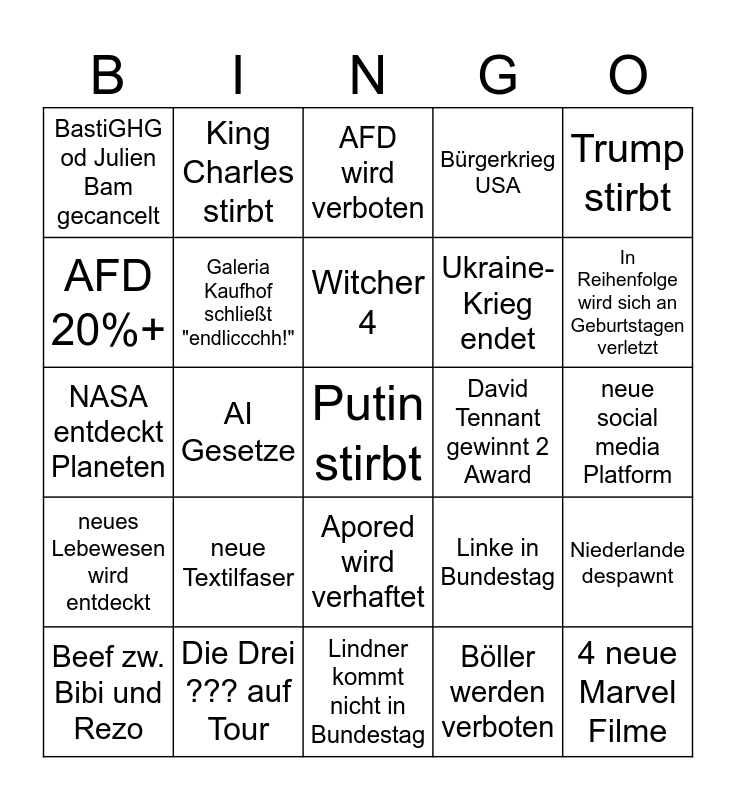 This bingo card has a free space and 24 words: neue Textilfaser, Die Drei ??? auf Tour, Witcher 4, Beef zw. Bibi und Rezo, Trump stirbt, BastiGHG od Julien Bam gecancelt, AFD 20%+, King Charles stirbt, David Tennant gewinnt 2 Award, Apored wird verhaftet, Ukraine-Krieg endet, NASA entdeckt Planeten, Linke in Bundestag, Niederlande despawnt, Galeria Kaufhof schließt "endliccchh!", Böller werden verboten, neue social media Platform, AFD wird verboten, In Reihenfolge wird sich an Geburtstagen verletzt, AI Gesetze, 4 neue Marvel Filme, neues Lebewesen wird entdeckt, Bürgerkrieg USA and Lindner kommt nicht in Bundestag.