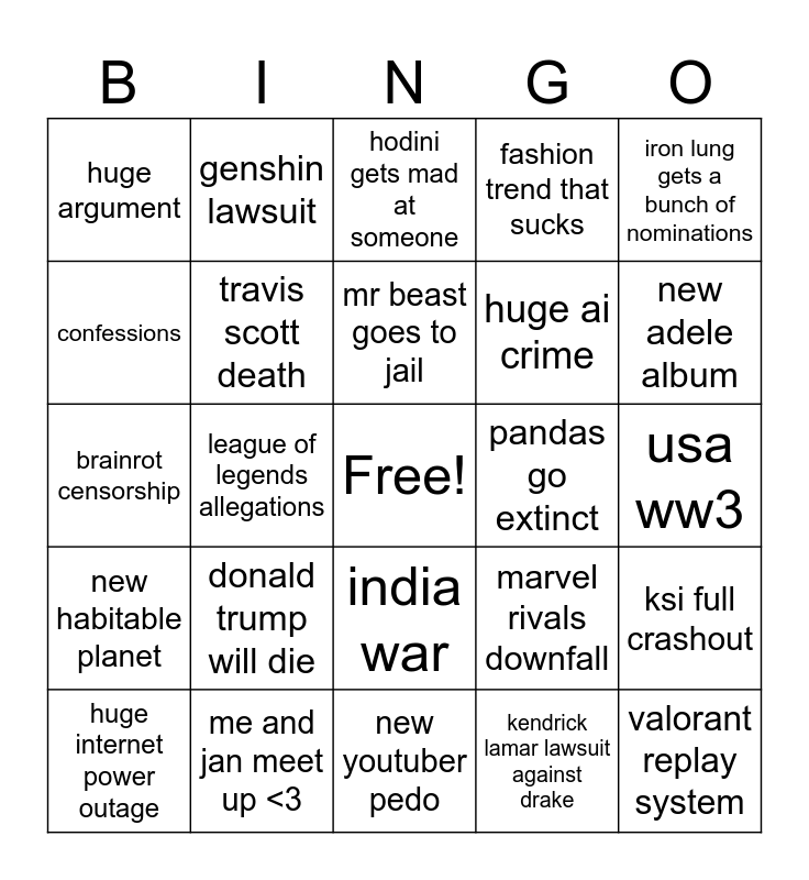 This bingo card has a free space and 24 words: donald trump will die, me and jan meet up <3, mr beast goes to jail, huge internet power outage, iron lung gets a bunch of nominations, huge argument, confessions, genshin lawsuit, pandas go extinct, india war, huge ai crime, brainrot censorship, marvel rivals downfall, ksi full crashout, travis scott death, kendrick lamar lawsuit against drake, usa ww3, hodini gets mad at someone, new adele album, league of legends allegations, valorant replay system, new habitable planet, fashion trend that sucks and new youtuber pedo.