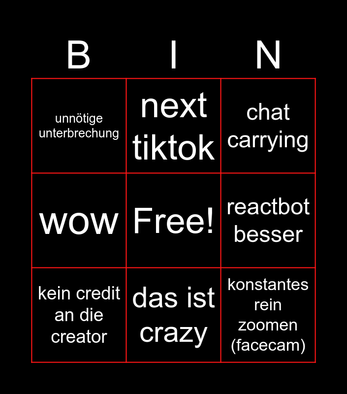 This bingo card has a free space and 8 words: reactbot besser, chat carrying, next tiktok, kein credit an die creator, unnötige unterbrechung, konstantes rein zoomen (facecam), wow and das ist crazy.