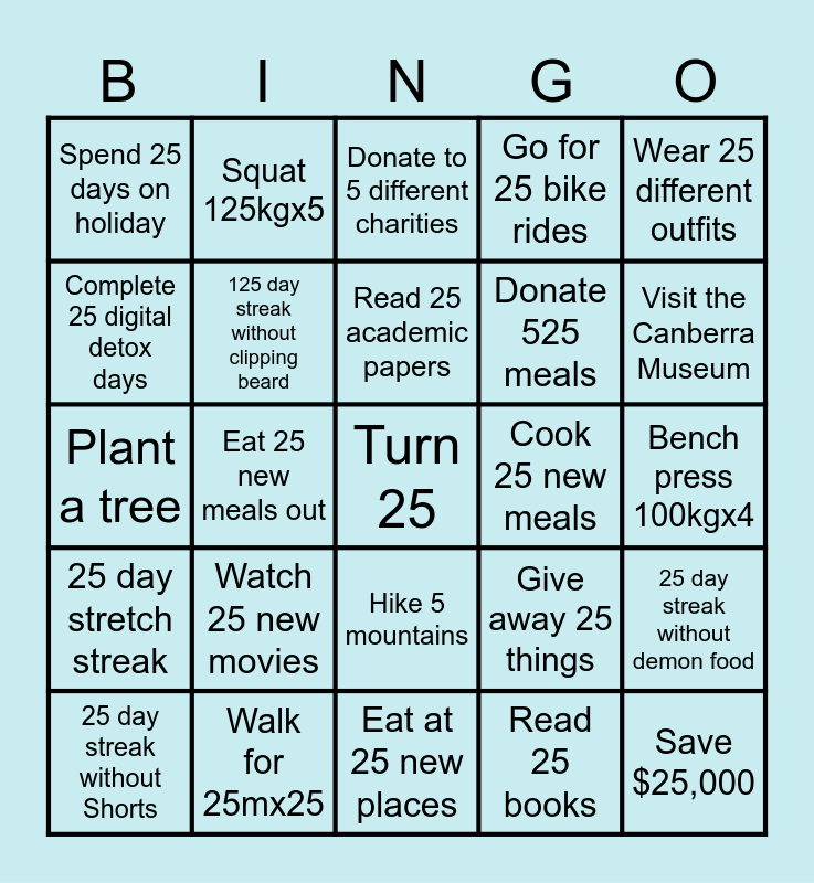 This bingo card has a free space and 24 words: Watch 25 new movies, Walk for 25mx25, Read 25 academic papers, 25 day streak without Shorts, Wear 25 different outfits, Spend 25 days on holiday, Complete 25 digital detox days, Squat 125kgx5, Cook 25 new meals, Hike 5 mountains, Donate 525 meals, Plant a tree, Give away 25 things, 25 day streak without demon food, 125 day streak without clipping beard, Read 25 books, Bench press 100kgx4, Donate to 5 different charities, Visit the Canberra Museum, Eat 25 new meals out, Save $25,000, 25 day stretch streak, Go for 25 bike rides and Eat at 25 new places.