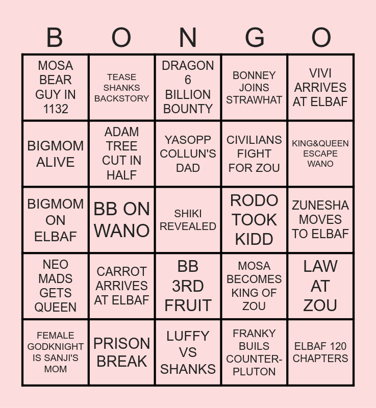 This bingo card has a free space and 24 words: CARROT ARRIVES AT ELBAF, PRISON BREAK, YASOPP COLLUN'S DAD, FEMALE GODKNIGHT IS SANJI'S MOM, VIVI ARRIVES AT ELBAF, MOSA BEAR GUY IN 1132, BIGMOM ALIVE, TEASE SHANKS BACKSTORY, RODO TOOK KIDD, BB 3RD FRUIT, CIVILIANS FIGHT FOR ZOU, BIGMOM ON ELBAF, MOSA BECOMES KING OF ZOU, LAW AT ZOU, ADAM TREE CUT IN HALF, FRANKY BUILS COUNTER-PLUTON, ZUNESHA MOVES TO ELBAF, DRAGON 6 BILLION BOUNTY, KING&QUEEN ESCAPE WANO, BB ON WANO, ELBAF 120 CHAPTERS, NEO MADS GETS QUEEN, BONNEY JOINS STRAWHAT and LUFFY VS SHANKS.