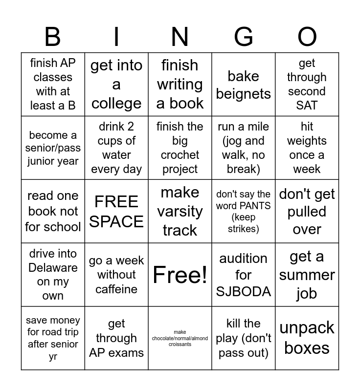 This bingo card has 26 words: Free!, kill the play (don't pass out), finish the big crochet project, get through AP exams, get through second SAT, finish AP classes with at least a B, become a senior/pass junior year, get into a college, don't get pulled over, audition for SJBODA, run a mile (jog and walk, no break), read one book not for school, get a summer job, save money for road trip after senior yr, FREE SPACE, get a haircut, bake beignets, drive into Delaware on my own, finish writing a book, make varsity track, hit weights once a week, make chocolate/normal/almond croissants, don't say the word PANTS (keep strikes), go a week without caffeine, drink 2 cups of water every day and unpack boxes.