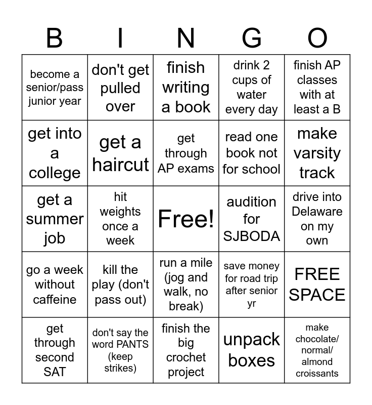 This bingo card has a free space and 25 words: kill the play (don't pass out), finish the big crochet project, get through AP exams, get through second SAT, finish AP classes with at least a B, become a senior/pass junior year, get into a college, don't get pulled over, audition for SJBODA, run a mile (jog and walk, no break), read one book not for school, get a summer job, save money for road trip after senior yr, FREE SPACE, get a haircut, bake beignets, drive into Delaware on my own, finish writing a book, make varsity track, hit weights once a week, make chocolate/ normal/ almond croissants, don't say the word PANTS (keep strikes), go a week without caffeine, drink 2 cups of water every day and unpack boxes.