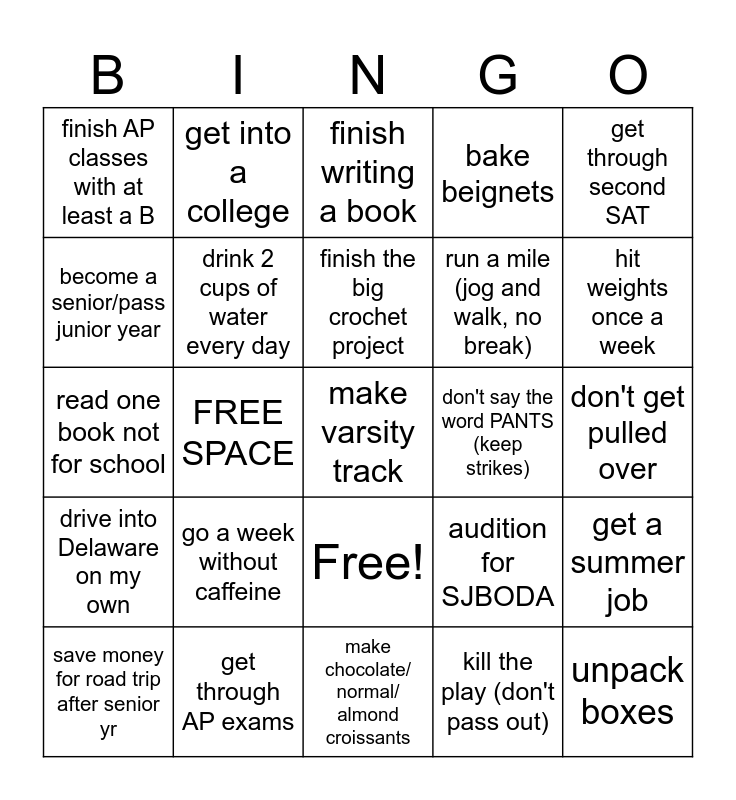This bingo card has 26 words: Free!, kill the play (don't pass out), finish the big crochet project, get through AP exams, get through second SAT, finish AP classes with at least a B, become a senior/pass junior year, get into a college, don't get pulled over, audition for SJBODA, run a mile (jog and walk, no break), read one book not for school, get a summer job, save money for road trip after senior yr, FREE SPACE, get a haircut, bake beignets, drive into Delaware on my own, finish writing a book, make varsity track, hit weights once a week, make chocolate/ normal/ almond croissants, don't say the word PANTS (keep strikes), go a week without caffeine, drink 2 cups of water every day and unpack boxes.