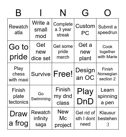 This bingo card has a free space and 24 words: Go Swimming, Rewatch infinity saga, Get some pride merch, Draw a frog, Submit a speedrun, Rewatch atla, Go to pride, Write a small mod, Design an OC, Finish my dnd class, Get a new plant, Play chess with maxi, Play DnD, Learn spinning a pen, Get new dice set, Get rid of sth I dont need, Finish Norwegian section 2, Complete a 3 year streak, Cook together with Marie, Survive, Klausur bestehen :), Finish plate tectonics, Custom PC and New Mc project.