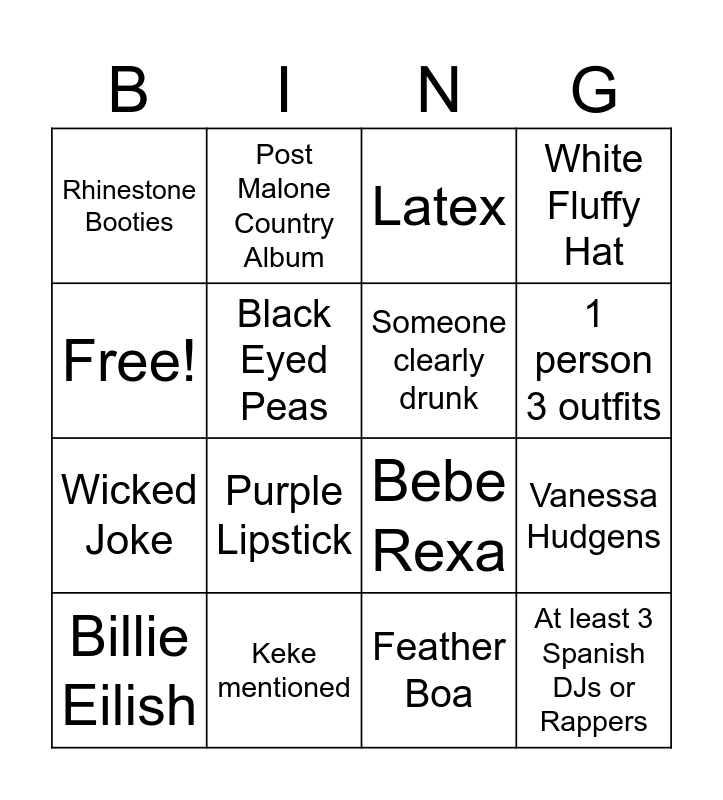 This bingo card has 16 words: Keke mentioned, Vanessa Hudgens, Latex, Rhinestone Booties, Wicked Joke, Post Malone Country Album, Bebe Rexa, Feather Boa, Free!, Black Eyed Peas, Billie Eilish, White Fluffy Hat, Purple Lipstick, 1 person 3 outfits, Someone clearly drunk and At least 3 Spanish DJs or Rappers.