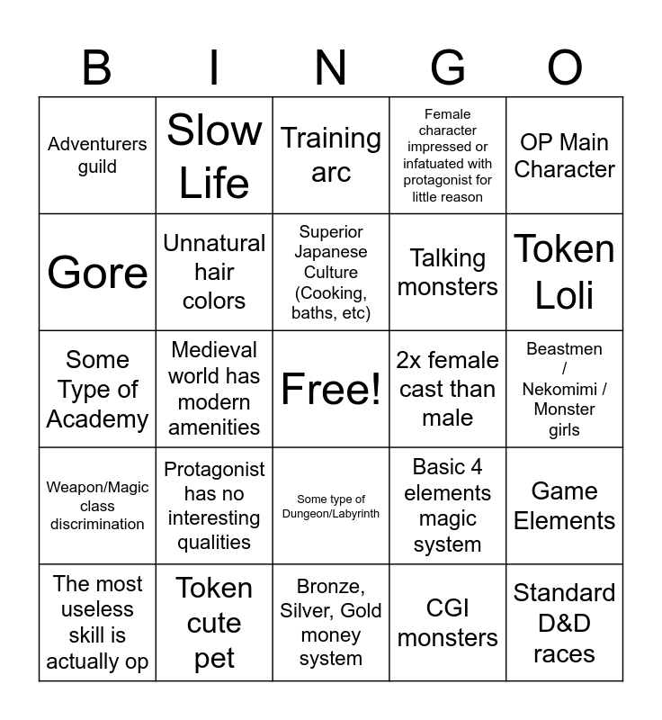 This bingo card has a free space and 29 words: The most useless skill is actually op, Evil God / Demon King, Medieval world has modern amenities, Multiple love interests, Adventurers guild, Training arc, Unnatural hair colors, Protagonist has no interesting qualities, 2x female cast than male, Token cute pet, Beastmen / Nekomimi / Monster girls, Standard D&D races, Bronze, Silver, Gold money system, CGI monsters, Token Loli, "Konosuba" City, Some type of Dungeon/Labyrinth, Weapon/Magic class discrimination, OP Main Character, Some Type of Academy, Basic 4 elements magic system, Fanservice Shot, Talking monsters, Gore, Female character impressed or infatuated with protagonist for little reason, Slow Life, Game Elements, Superior Japanese Culture (Cooking, baths, etc) and Weapon Swings not Animated.