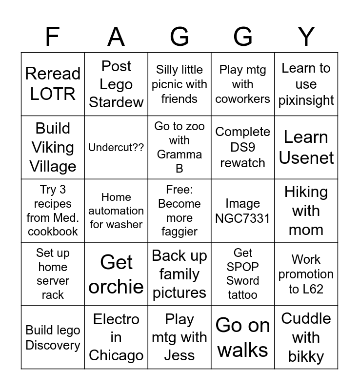 This bingo card has a free space and 24 words: Get orchie, Electro in Chicago, Go to zoo with Gramma B, Build lego Discovery, Learn to use pixinsight, Reread LOTR, Build Viking Village, Post Lego Stardew, Image NGC7331, Back up family pictures, Complete DS9 rewatch, Try 3 recipes from Med. cookbook, Get SPOP Sword tattoo, Work promotion to L62, Undercut??, Go on walks, Hiking with mom, Silly little picnic with friends, Learn Usenet, Home automation for washer, Cuddle with bikky, Set up home server rack, Play mtg with coworkers and Play mtg with Jess.