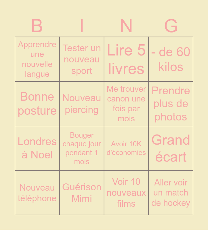 This bingo card has 16 words: Guérison Mimi, Grand écart, Lire 5 livres, Apprendre une nouvelle langue, Londres à Noel, Tester un nouveau sport, Avoir 10K d'économies, Voir 10 nouveaux films, Bonne posture, Nouveau piercing, Nouveau téléphone, - de 60 kilos, Bouger chaque jour pendant 1 mois, Prendre plus de photos, Me trouver canon une fois par mois and Aller voir un match de hockey.
