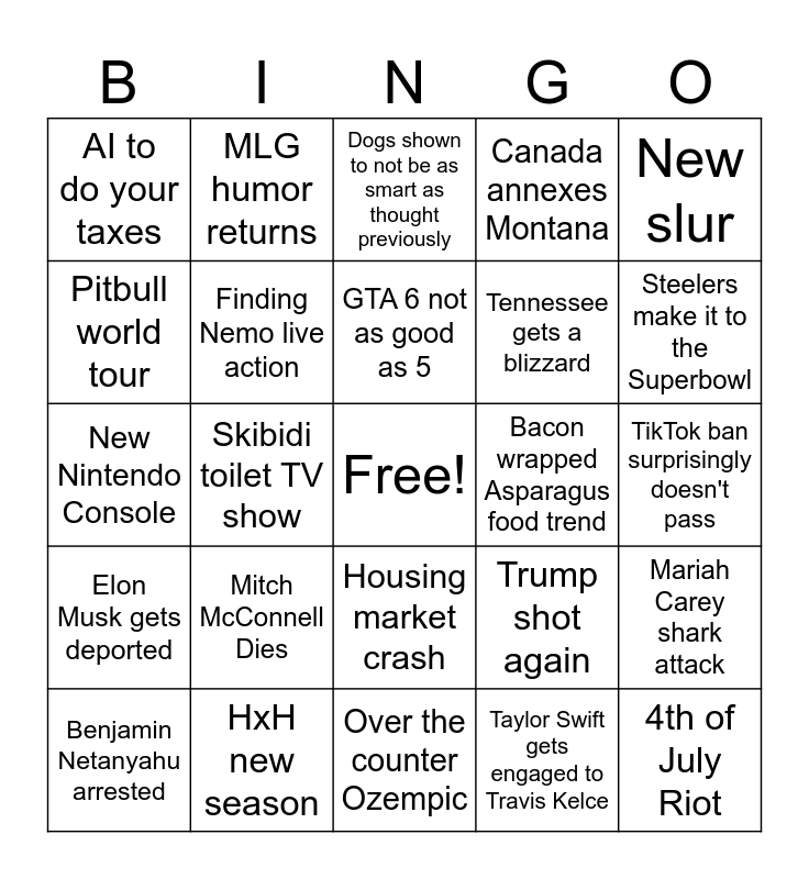 This bingo card has a free space and 24 words: Mitch McConnell Dies, HxH new season, GTA 6 not as good as 5, Benjamin Netanyahu arrested, New slur, AI to do your taxes, Pitbull world tour, MLG humor returns, Bacon wrapped Asparagus food trend, Housing market crash, Tennessee gets a blizzard, New Nintendo Console, Trump shot again, Mariah Carey shark attack, Finding Nemo live action, Taylor Swift gets engaged to Travis Kelce, TikTok ban surprisingly doesn't pass, Dogs shown to not be as smart as thought previously, Steelers make it to the Superbowl, Skibidi toilet TV show, 4th of July Riot, Elon Musk gets deported, Canada annexes Montana and Over the counter Ozempic.