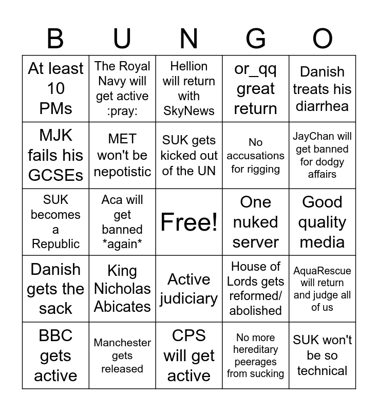 This bingo card has a free space and 24 words: King Nicholas Abicates, Manchester gets released, SUK gets kicked out of the UN, BBC gets active, Danish treats his diarrhea, At least 10 PMs, MJK fails his GCSEs, The Royal Navy will get active :pray:, One nuked server, Active judiciary, No accusations for rigging, SUK becomes a Republic, House of Lords gets reformed/ abolished, AquaRescue will return and judge all of us, MET won't be nepotistic, No more hereditary peerages from sucking, Good quality media, Hellion will return with SkyNews, JayChan will get banned for dodgy affairs, Aca will get banned *again*, SUK won't be so technical, Danish gets the sack, or_qq great return and CPS will get active.