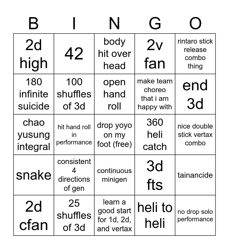 This bingo card has a free space and 24 words: consistent 4 directions of gen, 25 shuffles of 3d, open hand roll, 2d cfan, rintaro stick release combo thing, 2d high, 180 infinite suicide, 42, 360 heli catch, continuous minigen, make team choreo that i am happy with, chao yusung integral, 3d fts, tainancide, 100 shuffles of 3d, heli to heli, nice double stick vertax combo, body hit over head, end 3d, hit hand roll in performance, no drop solo performance, snake, 2v fan and learn a good start for 1d, 2d, and vertax.