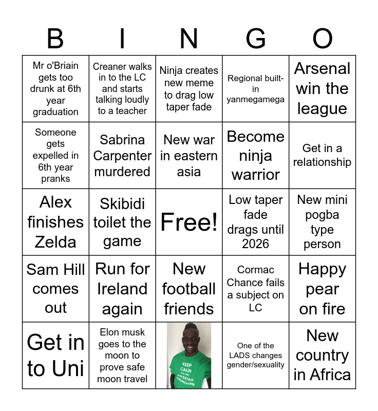 This bingo card has 1 images, a free space and 23 words: Run for Ireland again, Elon musk goes to the moon to prove safe moon travel, New war in eastern asia, Get in to Uni, Arsenal win the league, Mr o'Briain gets too drunk at 6th year graduation, Someone gets expelled in 6th year pranks, Creaner walks in to the LC and starts talking loudly to a teacher, Low taper fade drags until 2026, New football friends, Become ninja warrior, Alex finishes Zelda, Cormac Chance fails a subject on LC, Happy pear on fire, Sabrina Carpenter murdered, One of the LADS changes gender/sexuality, New mini pogba type person, Ninja creates new meme to drag low taper fade, Get in a relationship, Skibidi toilet the game, New country in Africa, Sam Hill comes out and Regional built-in yanmegamega.