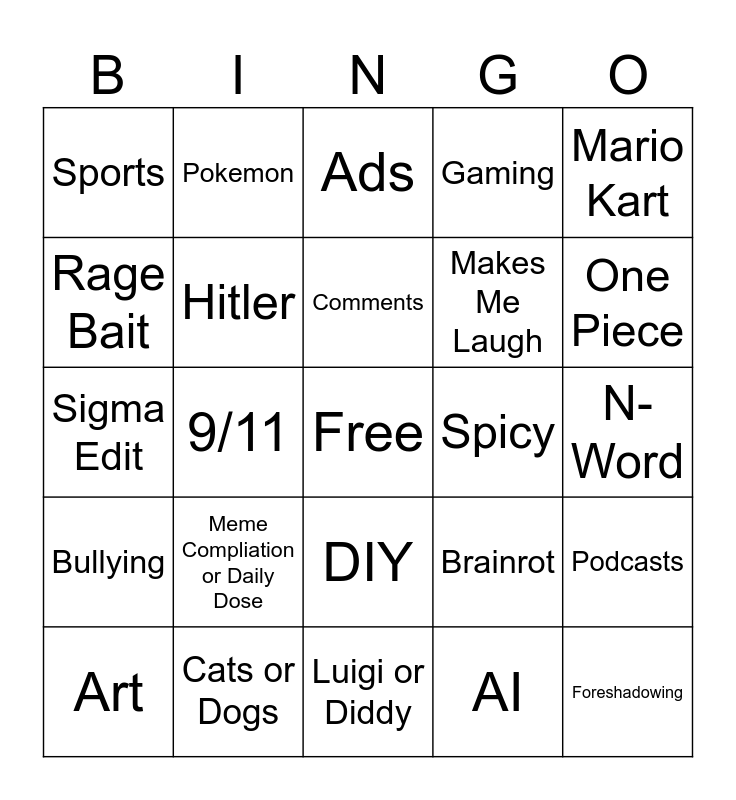 This bingo card has a free space and 24 words: Meme Compliation or Daily Dose, Cats or Dogs, Comments, Art, Mario Kart, Sports, Rage Bait, Pokemon, Spicy, DIY, Makes Me Laugh, Sigma Edit, Brainrot, Podcasts, Hitler, AI, N-Word, Ads, One Piece, 9/11, Foreshadowing, Bullying, Gaming and Luigi or Diddy.
