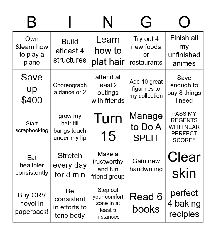 This bingo card has a free space and 24 words: Stretch every day for 8 min, Be consistent in efforts to tone body, attend at least 2 outings with friends, Buy ORV novel in paperback!, Finish all my unfinished animes, Own &learn how to play a piano, Save up $400, Build atleast 4 structures, Manage to Do A SPLIT, Make a trustworthy and fun friend group, Add 10 great figurines to my collection, Start scrapbooking, Gain new handwriting, Clear skin, Choreograph a dance or 2, Read 6 books, PASS MY REGENTS WITH NEAR PERFECT SCORE!!, Learn how to plat hair, Save enough to buy 8 things i need, grow my hair till bangs touch under my lip, perfect 4 baking recipies, Eat healthier consistently, Try out 4 new foods or restaurants and Step out your comfort zone in at least 5 instances.