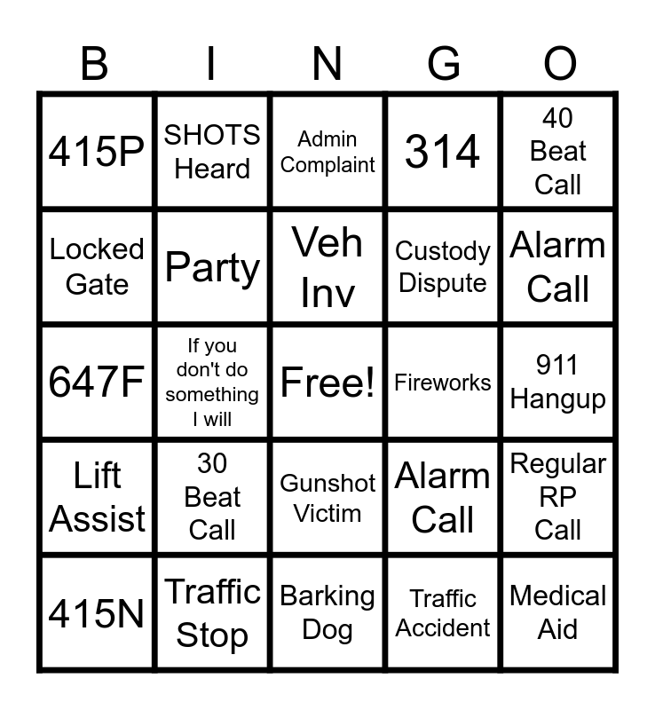 This bingo card has a free space and 24 words: 30 Beat Call, Traffic Stop, Veh Inv, 415N, 40 Beat Call, 415P, Locked Gate, SHOTS Heard, Fireworks, Gunshot Victim, Custody Dispute, 647F, Alarm Call, Regular RP Call, Party, Traffic Accident, 911 Hangup, Admin Complaint, Alarm Call, If you don't do something I will, Medical Aid, Lift Assist, 314 and Barking Dog.