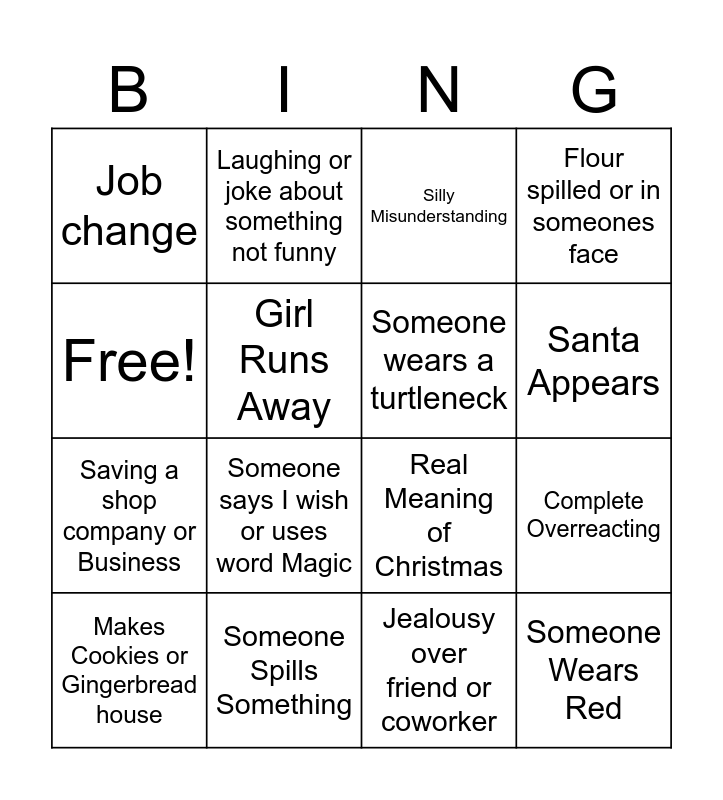 This bingo card has 16 words: Someone Spills Something, Complete Overreacting, Silly Misunderstanding, Job change, Saving a shop company or Business, Laughing or joke about something not funny, Real Meaning of Christmas, Jealousy over friend or coworker, Free!, Girl Runs Away, Makes Cookies or Gingerbread house, Flour spilled or in someones face, Someone says I wish or uses word Magic, Santa Appears, Someone wears a turtleneck and Someone Wears Red.
