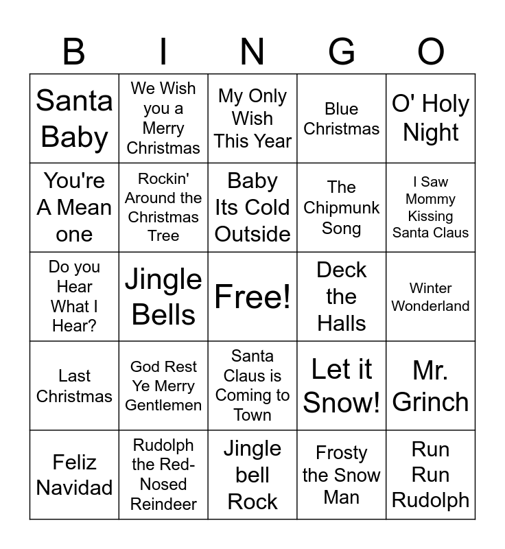 This bingo card has a free space and 33 words: Here Comes Santa Claus, All I want For Christmas Is You, Jingle Bells, Mary, Did you know?, Last Christmas, Rockin' Around the Christmas Tree, O' Holy Night, Feliz Navidad, We Wish you a Merry Christmas, Silent Night, Baby Its Cold Outside, My Only Wish This Year, Christmas Shoes, I Want a Hippopotamus For Christmas, Deck the Halls, I Saw Mommy Kissing Santa Claus, Rudolph the Red-Nosed Reindeer, Do you Hear What I Hear?, God Rest Ye Merry Gentlemen, Let it Snow!, Santa Claus is Coming to Town, Grandma Got Run over By a Reindeer, Santa Baby, Winter Wonderland, Jingle bell Rock, Run Run Rudolph, Blue Christmas, The Chipmunk Song, You're A Mean one, Mr. Grinch, Where are you Christmas, Frosty the Snow Man and Its Beginning to Look a lot Like Christmas.