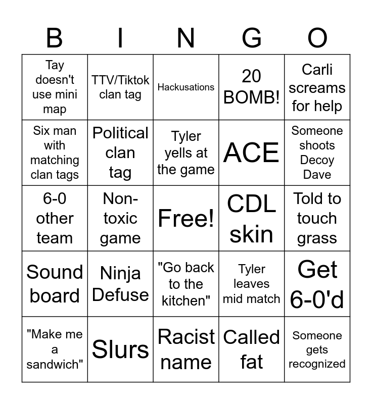 This bingo card has a free space and 26 words: "Go back to the kitchen", Called fat, Tyler yells at the game, Slurs, Carli screams for help, Tay doesn't use mini map, Six man with matching clan tags, TTV/Tiktok clan tag, Told to touch grass, Tyler leaves mid match, ACE, 6-0 other team, Get 6-0'd, "Make me a sandwich", Non-toxic game, Riot Shield, 20 BOMB!, Sound board, Hackusations, Someone gets recognized, Someone shoots Decoy Dave, Racist name, CDL skin, Ninja Defuse, Political clan tag and Full team rage quit.