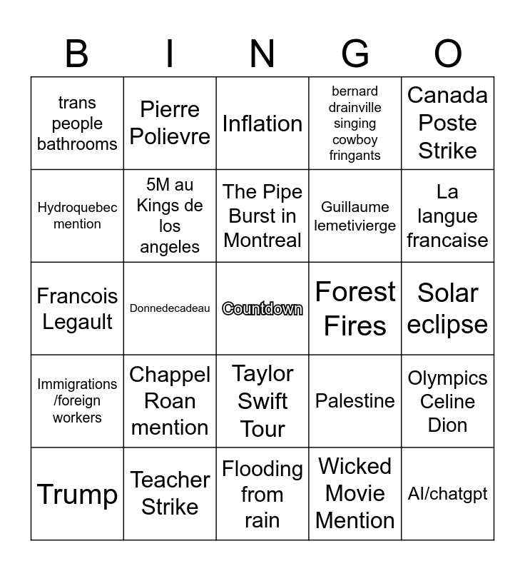 This bingo card has a free space and 24 words: Chappel Roan mention, Teacher Strike, The Pipe Burst in Montreal, Trump, Canada Poste Strike, trans people bathrooms, Hydroquebec mention, Pierre Polievre, Forest Fires, Taylor Swift Tour, Guillaume lemetivierge, Francois Legault, Palestine, Olympics Celine Dion, 5M au Kings de los angeles, Wicked Movie Mention, Solar eclipse, Inflation, La langue francaise, Donnedecadeau, AI/chatgpt, Immigrations /foreign workers, bernard drainville singing cowboy fringants and Flooding from rain.