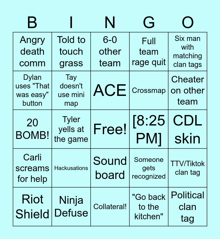This bingo card has a free space and 32 words: "Go back to the kitchen", Called fat, Tyler yells at the game, Slurs, Carli screams for help, Tay doesn't use mini map, Six man with matching clan tags, TTV/Tiktok clan tag, Told to touch grass, Tyler leaves mid match, ACE, 6-0 other team, Get 6-0'd, "Make me a sandwich", [8:25 PM], Non-toxic game, Riot Shield, 20 BOMB!, Sound board, Hackusations, Someone gets recognized, Someone shoots Decoy Dave, CDL skin, Ninja Defuse, Political clan tag, Full team rage quit, Crossmap, Dylan uses "That was easy" button, Angry death comm, Collateral!, 1v4 clutch and Cheater on other team.