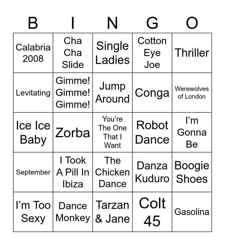 This bingo card has 56 words: Sk8er Boi, I’m Too Sexy, Hot Hot Hot, Calabria 2008, Tarzan & Jane, Traag, Gimme! Gimme! Gimme!, Suavemente, Conga, Dance The Night, Cotton Eye Joe, Pepas, Follow the Leader, Friday, The Ketchup Song, Macarena, Thriller, Zorba, Wannabe, You’re The One That I Want, Robot Dance, Party In The USA, Danza Kuduro, Single Ladies, Sk8er Boi, Jump Around, Hot To Go, Espresso, Werewolves of London, Uptown Funk, Shake It Off, Hey Mickey, YMCA, Hey Ya!, I’m Gonna Be, Levitating, Ice Ice Baby, Anaconda, September, Cha Cha Slide, The Chicken Dance, Gasolina, Hips Dont Lie, WAP, Havana, I Took A Pill In Ibiza, Dance Monkey, Mambo No. 5, Blurred Lines, Lollipop, Colt 45, My Neck, My Back, The Hustle, Milkshake, Boogie Shoes and Tubthumping.