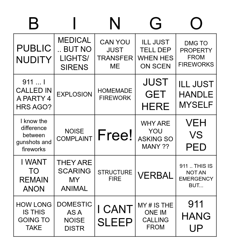 This bingo card has a free space and 28 words: 911 .. THIS IS NOT AN EMERGENCY BUT..., IM AT MY HOUSE, JUST GET HERE, MY # IS THE ONE IM CALLING FROM, 911 ... I CALLED IN A PARTY 4 HRS AGO?, CAN YOU JUST TRANSFER ME, MEDICAL .. BUT NO LIGHTS/ SIRENS, I WANT TO REMAIN ANON, WHY ARE YOU ASKING SO MANY ??, HOW LONG IS THIS GOING TO TAKE, I know the difference between gunshots and fireworks, ILL JUST TELL DEP WHEN HES ON SCEN, DOMESTIC AS A NOISE DISTR, I CANT SLEEP, ILL JUST HANDLE MYSELF, , ARE THEY GOING TO KNOW ITS ME, THEY ARE SCARING MY ANIMAL, EXPLOSION, HOMEMADE FIREWORK, STRUCTURE FIRE, PUBLIC NUDITY, PUBLIC INTOXICATION, 911 HANG UP, NOISE COMPLAINT, VEH VS PED, VERBAL, DMG TO PROPERTY FROM FIREWORKS and KAREN / KEVIN WANTS TO SPEAK WITH SUPERVISOR.