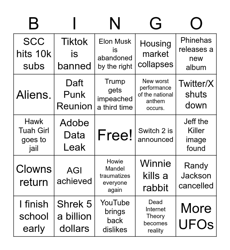 This bingo card has a free space and 24 words: AGI achieved, Shrek 5 a billion dollars, Trump gets impeached a third time, I finish school early, Phinehas releases a new album, SCC hits 10k subs, Aliens., Tiktok is banned, Switch 2 is announced, Howie Mandel traumatizes everyone again, New worst performance of the national anthem occurs., Hawk Tuah Girl goes to jail, Winnie kills a rabbit, Randy Jackson cancelled, Daft Punk Reunion, Dead Internet Theory becomes reality, Jeff the Killer image found, Elon Musk is abandoned by the right, Twitter/X shuts down, Adobe Data Leak, More UFOs, Clowns return, Housing market collapses and YouTube brings back dislikes.
