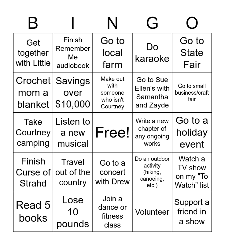 This bingo card has a free space and 24 words: Travel out of the country, Lose 10 pounds, Make out with someone who isn't Courtney, Read 5 books, Go to State Fair, Get together with Little, Crochet mom a blanket, Finish Remember Me audiobook, Write a new chapter of any ongoing works, Go to a concert with Drew, Go to Sue Ellen's with Samantha and Zayde, Take Courtney camping, Do an outdoor activity (hiking, canoeing, etc.), Watch a TV show on my "To Watch" list, Savings over $10,000, Volunteer, Go to a holiday event, Go to local farm, Go to small business/craft fair, Listen to a new musical, Support a friend in a show, Finish Curse of Strahd, Do karaoke and Join a dance or fitness class.