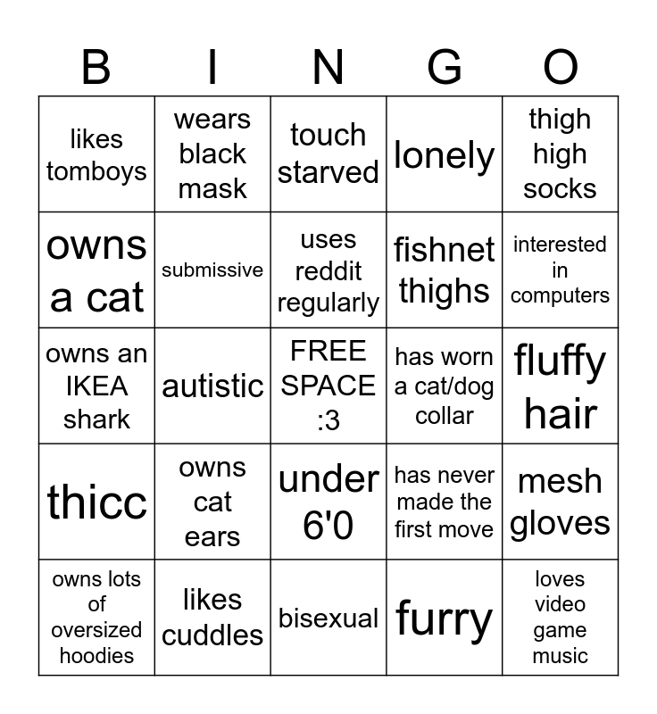 This bingo card has a free space and 24 words: owns cat ears, likes cuddles, uses reddit regularly, owns lots of oversized hoodies, thigh high socks, likes tomboys, owns a cat, wears black mask, has worn a cat/dog collar, under 6'0, fishnet thighs, owns an IKEA shark, has never made the first move, mesh gloves, submissive, furry, fluffy hair, touch starved, interested in computers, autistic, loves video game music, thicc, lonely and bisexual.