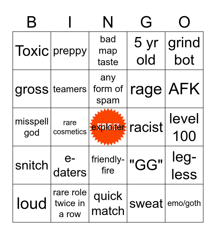 This bingo card has a free space and 24 words: e-daters, rare role twice in a row, any form of spam, loud, grind bot, Toxic, gross, preppy, racist, friendly-fire, rage, misspell god, "GG", leg-less, teamers, sweat, level 100, bad map taste, AFK, rare cosmetics, emo/goth, snitch, 5 yr old and quick match.