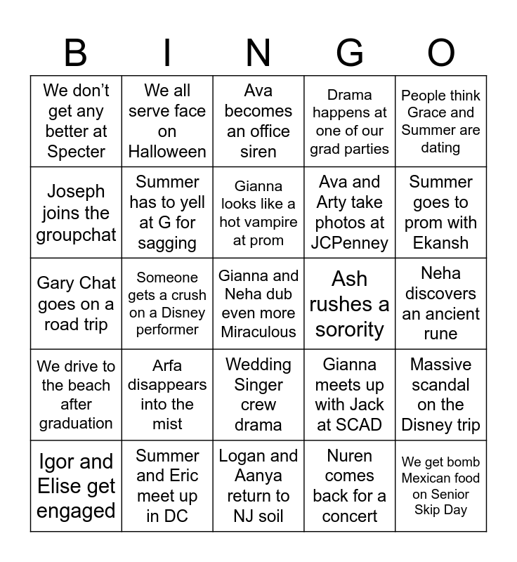 This bingo card has a free space and 24 words: Arfa disappears into the mist, Summer and Eric meet up in DC, Gianna looks like a hot vampire at prom, Igor and Elise get engaged, People think Grace and Summer are dating, We don’t get any better at Specter, Joseph joins the groupchat, We all serve face on Halloween, Ash rushes a sorority, Wedding Singer crew drama, Ava and Arty take photos at JCPenney, Gary Chat goes on a road trip, Gianna meets up with Jack at SCAD, Massive scandal on the Disney trip, Summer has to yell at G for sagging, Nuren comes back for a concert, Neha discovers an ancient rune, Ava becomes an office siren, Summer goes to prom with Ekansh, Someone gets a crush on a Disney performer, We get bomb Mexican food on Senior Skip Day, We drive to the beach after graduation, Drama happens at one of our grad parties and Logan and Aanya return to NJ soil.