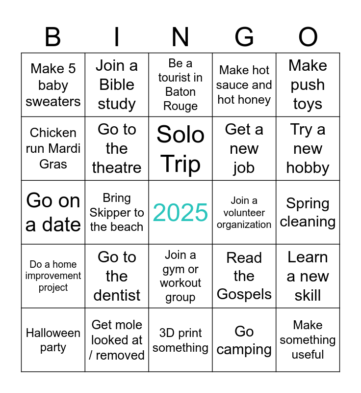 This bingo card has a free space and 24 words: Go to the dentist, Get mole looked at / removed, Solo Trip, Halloween party, Make push toys, Make 5 baby sweaters, Chicken run Mardi Gras, Join a Bible study, Join a volunteer organization, Join a gym or workout group, Get a new job, Go on a date, Read the Gospels, Learn a new skill, Go to the theatre, Go camping, Spring cleaning, Be a tourist in Baton Rouge, Try a new hobby, Bring Skipper to the beach, Make something useful, Do a home improvement project, Make hot sauce and hot honey and 3D print something.