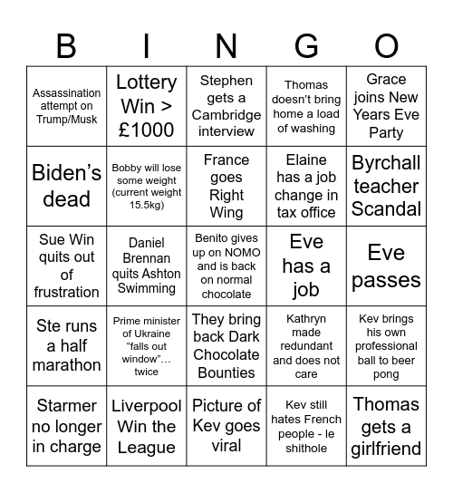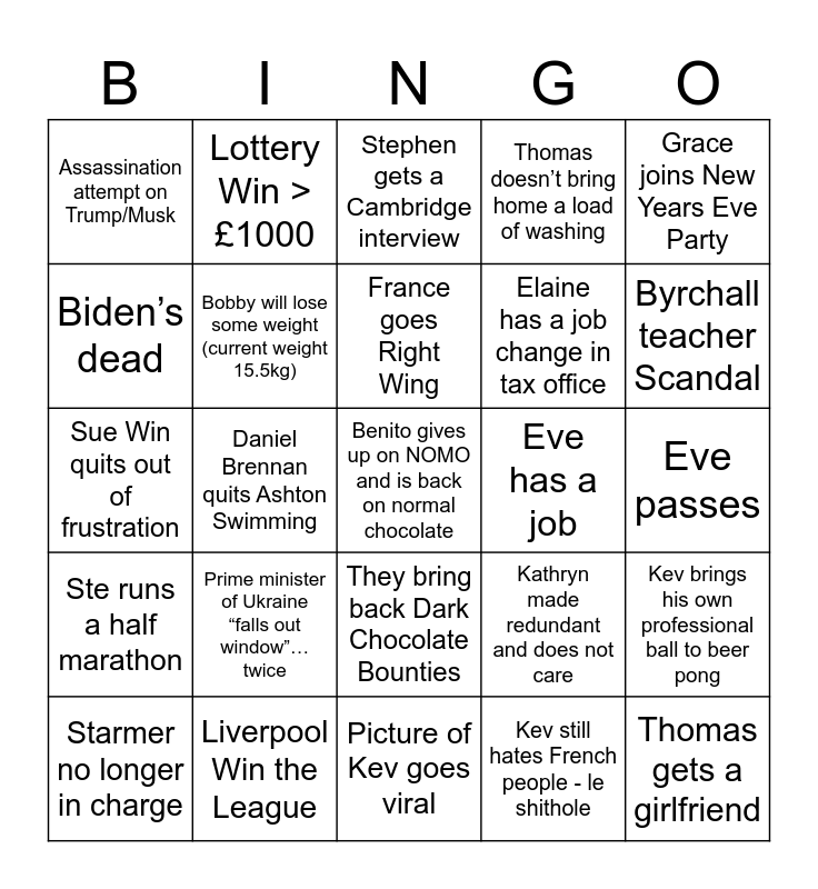 This bingo card has a free space and 24 words: Prime minister of Ukraine “falls out window”… twice, Liverpool Win the League, France goes Right Wing, Starmer no longer in charge, Grace joins New Years Eve Party, Assassination attempt on Trump/Musk, Biden’s dead, Lottery Win > £1000, Eve has a job, They bring back Dark Chocolate Bounties, Elaine has a job change in tax office, Sue Win quits out of frustration, Kathryn made redundant and does not care, Kev brings his own professional ball to beer pong, Bobby will lose some weight (current weight 15.5kg), Kev still hates French people - le shithole, Eve passes, Stephen gets a Cambridge interview, Byrchall teacher Scandal, Daniel Brennan quits Ashton Swimming, Thomas gets a girlfriend, Ste runs a half marathon, Thomas doesn’t bring home a load of washing and Picture of Kev goes viral.