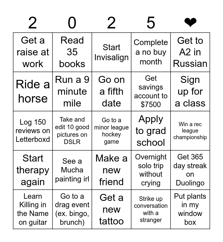 This bingo card has 25 words: See a Mucha painting irl, Get a new tattoo, Go on a fifth date, Learn Killing in the Name on guitar, Get to A2 in Russian, Get a raise at work, Ride a horse, Read 35 books, Apply to grad school, Make a new friend, Get savings account to $7500, Log 150 reviews on Letterboxd, Overnight solo trip without crying, Get 365 day streak on Duolingo, Run a 9 minute mile, Put plants in my window box, Win a rec league championship, Start Invisalign, Sign up for a class, Take and edit 10 good pictures on DSLR, Go to a minor league hockey game, Go to a drag event (ex. bingo, brunch), Start therapy again, Complete a no buy month and Strike up conversation with a stranger.