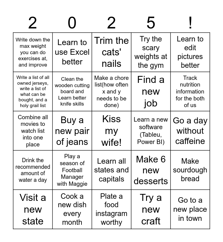 This bingo card has a free space and 24 words: Play a season of Football Manager with Maggie, Cook a new dish every month, Make a chore list(how often x and y needs to be done), Visit a new state, Learn to edit pictures better, Write down the max weight you can do exercises at, and improve, Write a list of all owned jerseys, write a list of what can be bought, and a holy grail list, Learn to use Excel better, Learn a new software (Tableu, Power BI), Learn all states and capitals, Find a new job, Combine all movies to watch list into one place, Make 6 new desserts, Make sourdough bread, Clean the wooden cutting board and Learn better knife skills, Try a new craft, Go a day without caffeine, Trim the cats' nails, Track nutrition information for the both of us, Buy a new pair of jeans, Go to a new place in town, Drink the recommended amount of water a day, Try the scary weights at the gym and Plate a food instagram worthy.
