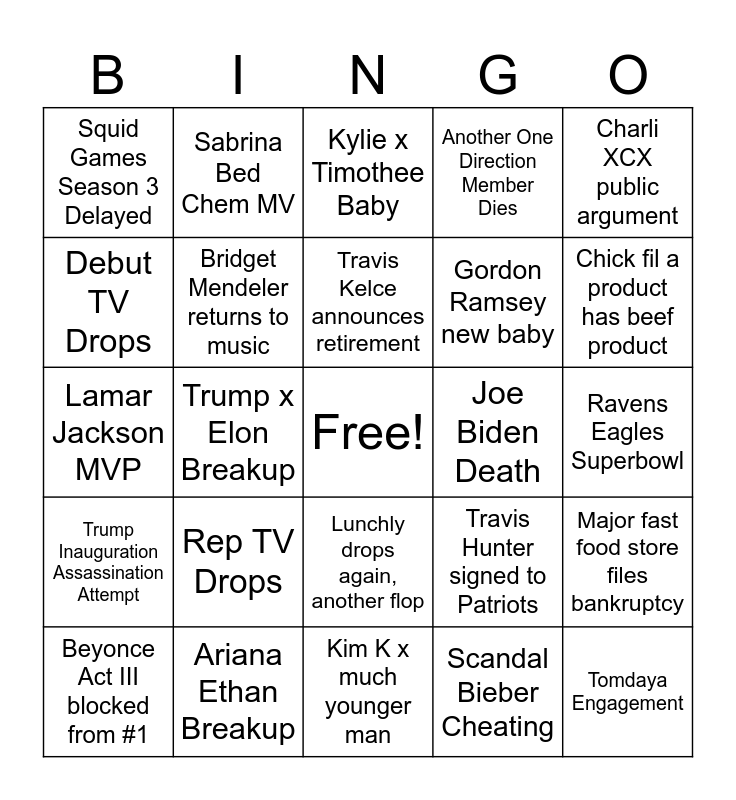 This bingo card has a free space and 24 words: Rep TV Drops, Ariana Ethan Breakup, Travis Kelce announces retirement, Beyonce Act III blocked from #1, Charli XCX public argument, Squid Games Season 3 Delayed, Debut TV Drops, Sabrina Bed Chem MV, Joe Biden Death, Lunchly drops again, another flop, Gordon Ramsey new baby, Lamar Jackson MVP, Travis Hunter signed to Patriots, Major fast food store files bankruptcy, Bridget Mendeler returns to music, Scandal Bieber Cheating, Ravens Eagles Superbowl, Kylie x Timothee Baby, Chick fil a product has beef product, Trump x Elon Breakup, Tomdaya Engagement, Trump Inauguration Assassination Attempt, Another One Direction Member Dies and Kim K x much younger man.