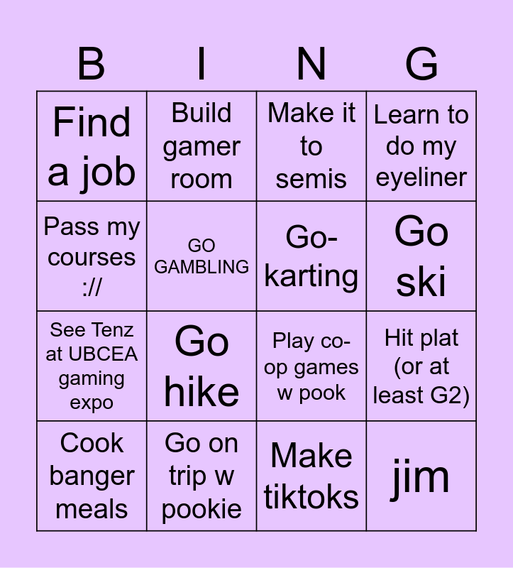 This bingo card has 16 words: Go on trip w pookie, Hit plat (or at least G2), Make it to semis, Find a job, See Tenz at UBCEA gaming expo, Build gamer room, Play co-op games w pook, Make tiktoks, Pass my courses ://, GO GAMBLING, Cook banger meals, Learn to do my eyeliner, Go hike, Go ski, Go-karting and jim.